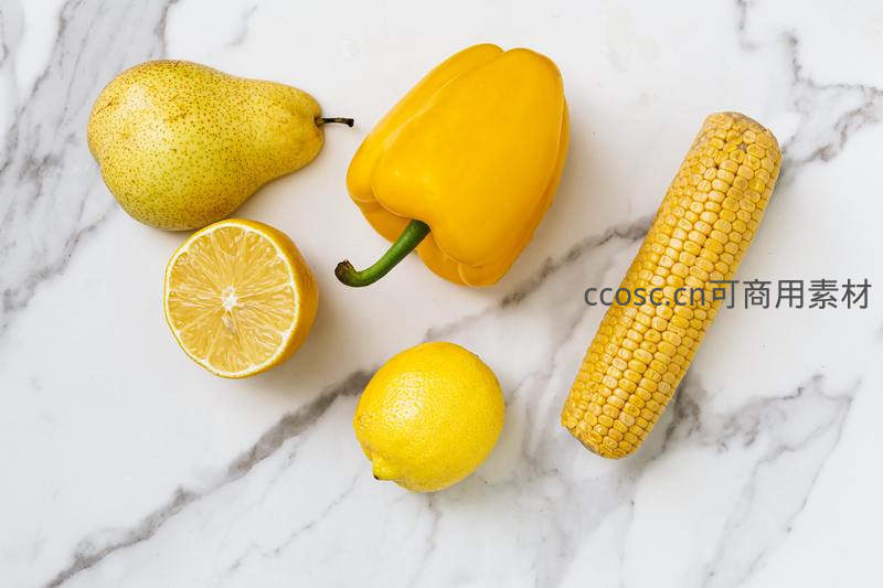 梨、柠檬、彩椒和玉米等黄色系蔬果在白色大理石台面上随意摆放,色彩和谐统一,展现自然食材的清新与健康的生活方式。