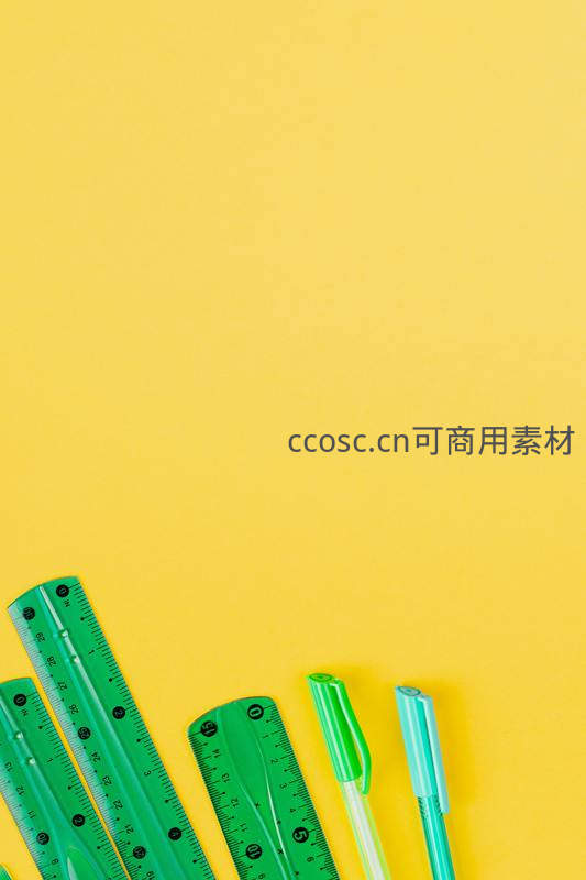 绿色尺子与荧光笔点缀黄色平面