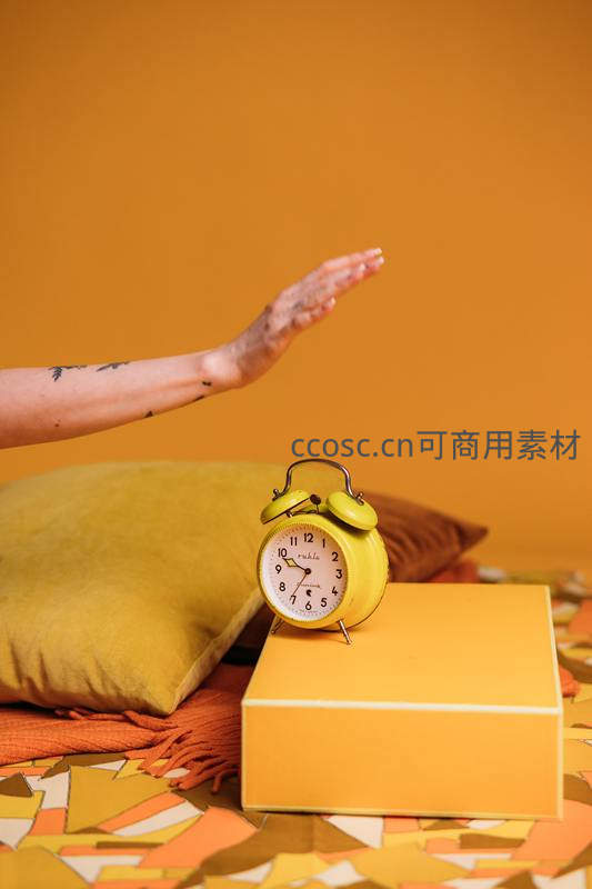 一只带有纹身的手臂从画面左侧伸出,正要触碰床头柜上的黄色复古闹钟,捕捉了清晨被唤醒的生动瞬间,充满生活气息。
