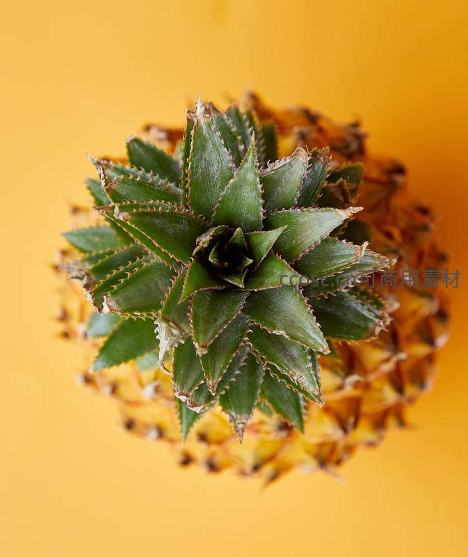 俯拍菠萝顶冠,绿叶尖刺与金黄果身的几何艺术
