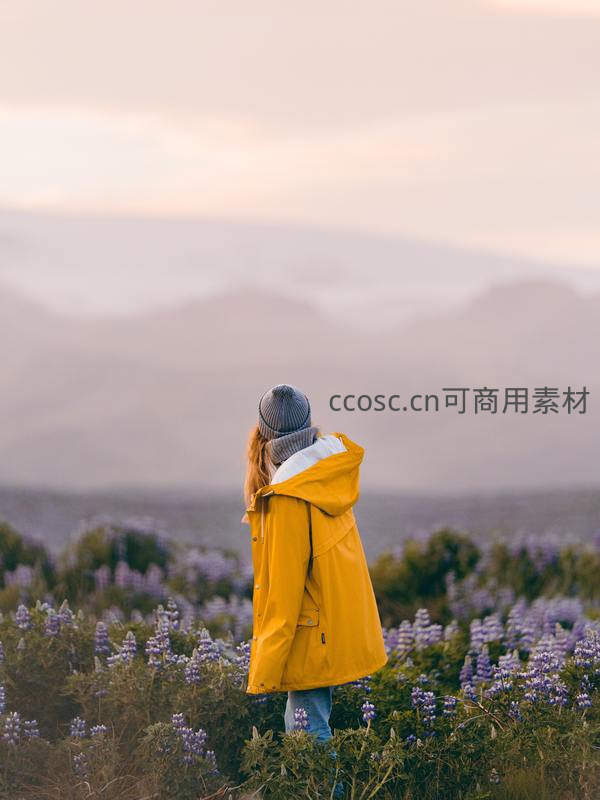 一位身着亮黄色雨衣、头戴针织帽的人静静伫立于紫色鲁冰花丛中,远眺朦胧山峦,画面充满诗意与旅途中的沉思感。