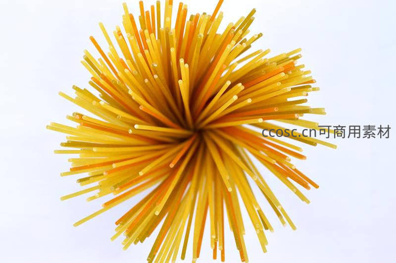 采用微距摄影技术,将干燥的意大利面条以放射状整齐排列,呈现如太阳般绽放的视觉效果,突显其天然质感与几何美感。
