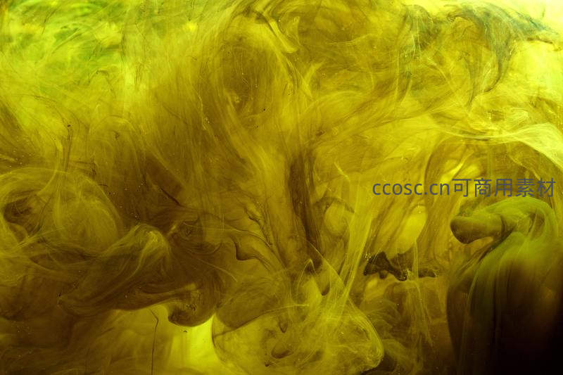 黄绿色的墨水在水中缓缓扩散、交融,形成如烟似雾的梦幻纹理,是极具视觉冲击力的抽象艺术背景素材。