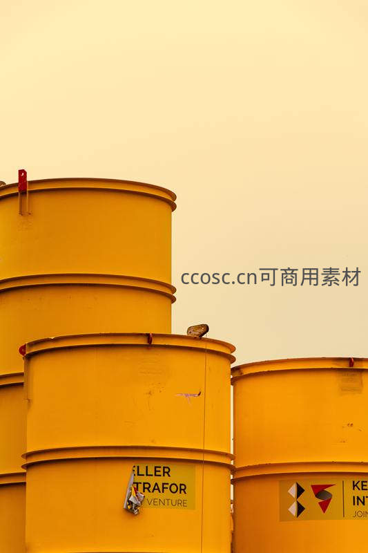 在柔和的黄昏光线下,数个巨大的黄色工业油桶层层堆叠,表面斑驳的贴纸与锈迹诉说着使用痕迹,一只小鸟栖息其上,增添一丝自然生机。