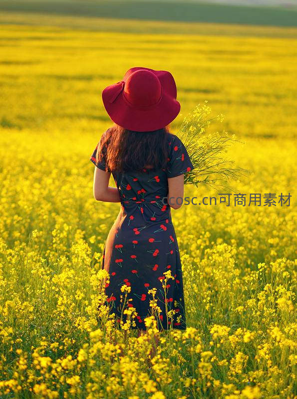 一位戴着红色宽檐帽的少女背对镜头,身穿樱桃图案连衣裙,手捧野花,伫立在无边无际的金色油菜花田中,沐浴在温暖的阳光下。