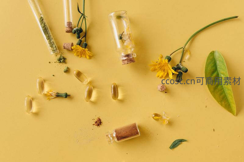透明试管内装满草本粉末,胶囊与新鲜花朵散落其旁,呈现从植物到保健品的科学转化过程。