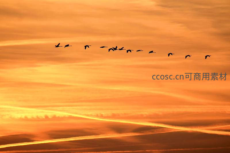 雁阵飞越霞光万丈,剪影勾勒迁徙之路