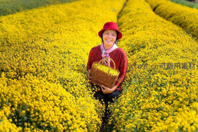 一位戴着红色帽子的农妇坐在金黄色菊花田中,怀抱竹篮面带灿烂笑容,展现了劳动收获的喜悦与乡村生活的美好。