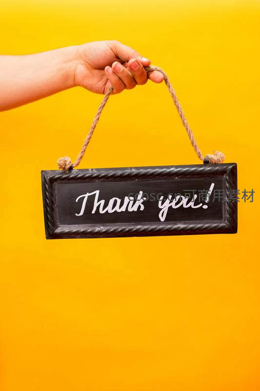 一只女性的手提着一块写有“Thank you!”的黑色小黑板,用麻绳悬挂,背景是温暖的橙黄色,传递出真诚的感谢之情。