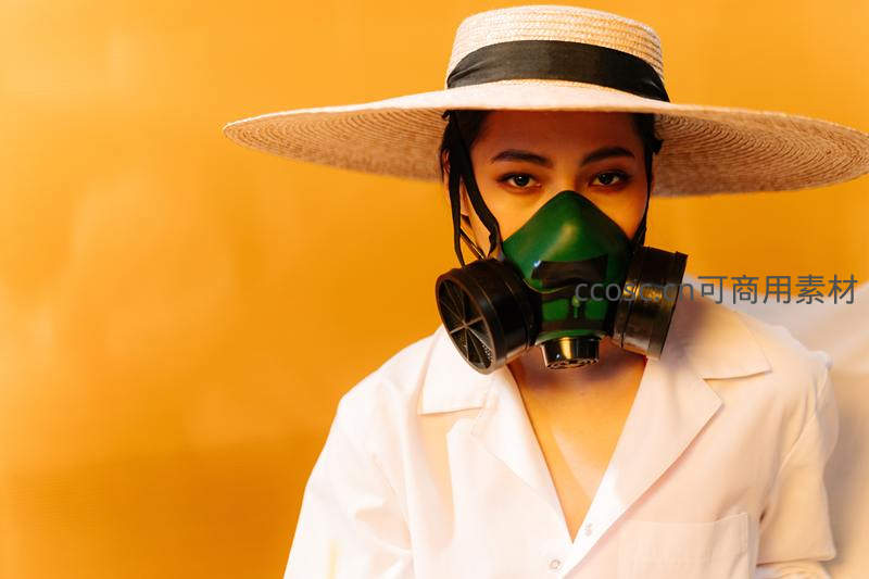一位女性身着白色外套,头戴宽边草帽,脸上佩戴着醒目的绿色工业防毒面具,凝视镜头,背景为温暖的橙黄色,融合了时尚、科幻与神秘感。
