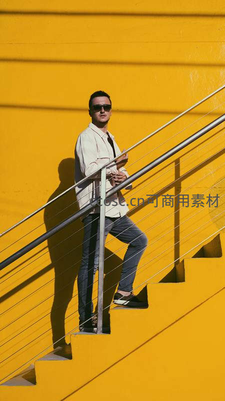 一位穿着休闲西装的男子站在黄色楼梯上,倚着金属扶手,阳光在他身后投下清晰的影子,充满现代都市感。