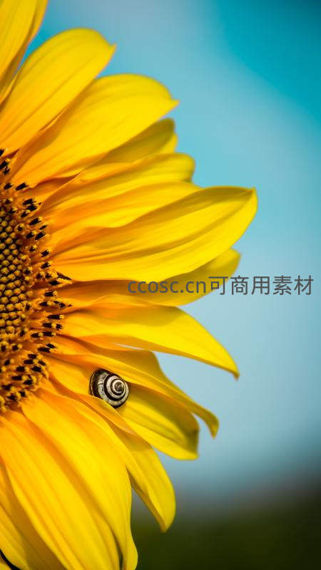 一朵盛开的向日葵花瓣上,一只小巧的蜗牛正缓缓爬行,背景是清澈的蓝天,微距镜头捕捉了生命律动与自然和谐共生的瞬间。