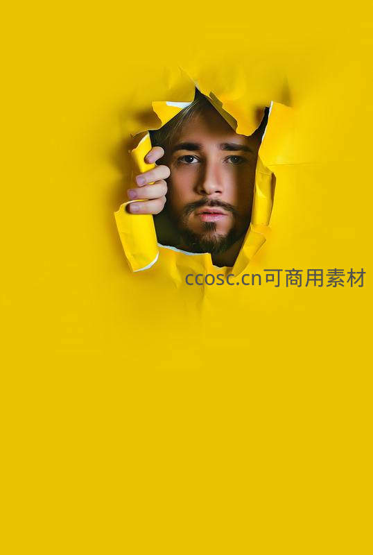 一名男子从被撕开的黄色纸张破洞中探出头来,眼神直视镜头,营造出强烈的视觉冲击和戏剧效果。