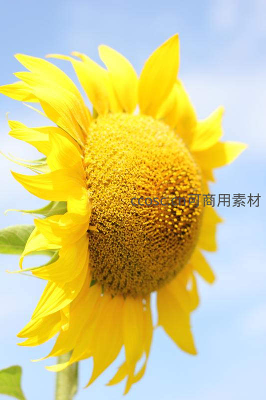 一朵盛开的向日葵在晴朗的蓝天下,金黄色的花瓣与花盘细节清晰可见,充满生命力与温暖感。