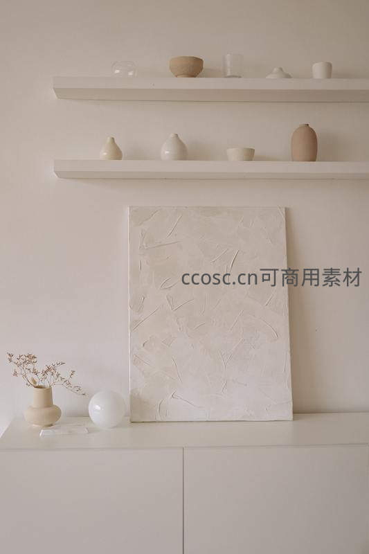 墙面悬挂着两层白色置物架,摆放着不同形态的米色陶器与玻璃器皿,下方柜面则放置一幅肌理丰富的奶油色抽象画,整体风格温柔治愈。