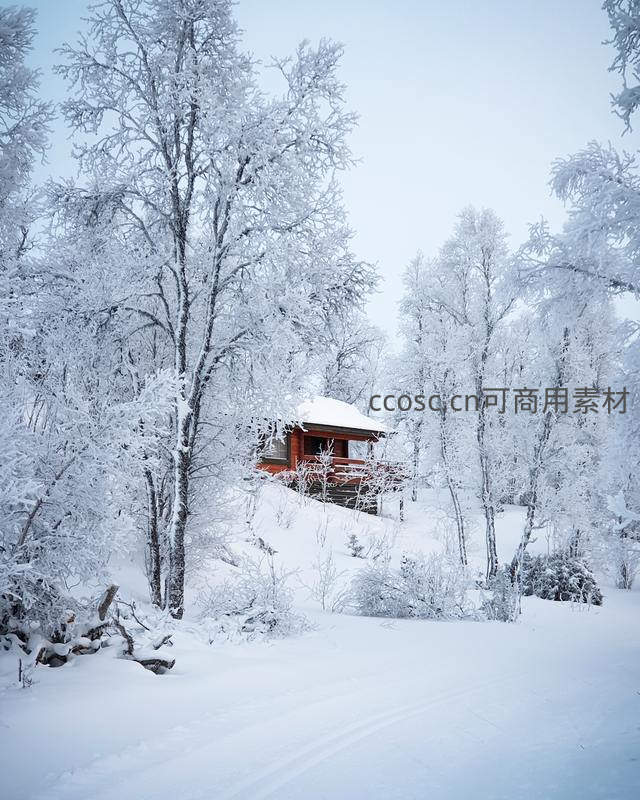 雪覆林间小屋静谧如画