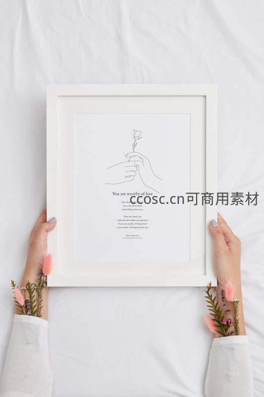 一双涂着淡紫色指甲油的手捧着一个白色画框,框内是线条勾勒的双手捧花图案及英文励志短句,周围点缀着干花,传递爱与自我肯定的温暖信息。