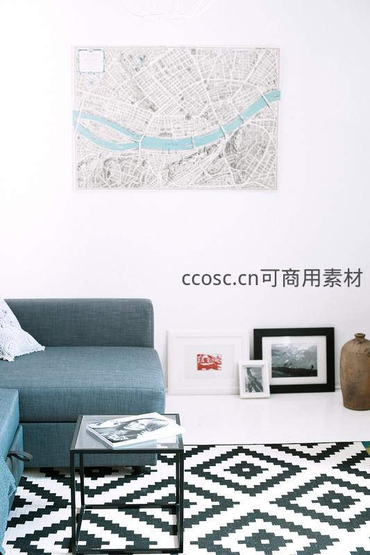 现代客厅几何地毯与地图装饰