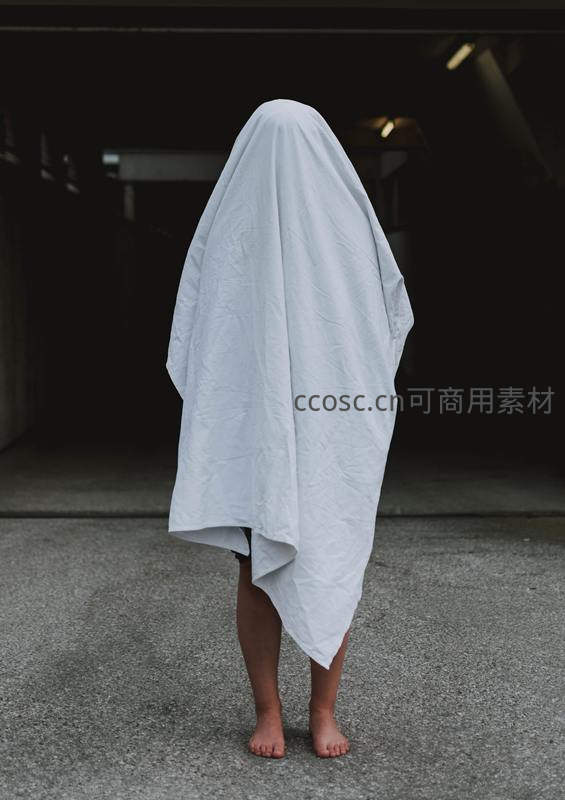 一人全身裹着白色布料,赤足站立在昏暗的地下通道中,营造出强烈的神秘感和艺术张力,引人无限遐想。