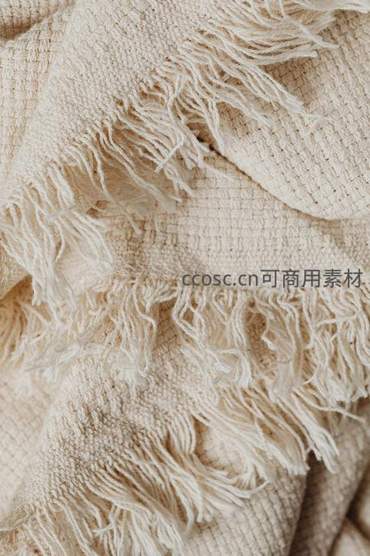 近距离拍摄一块米色的针织毛毯,清晰展现其粗犷的编织结构与蓬松的流苏边缘,质感柔软温暖,是营造舒适居家环境的理想素材。