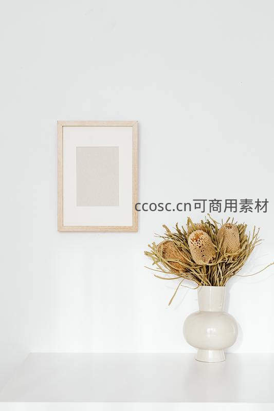 白色圆瓶干花与木质画框的极简搭配