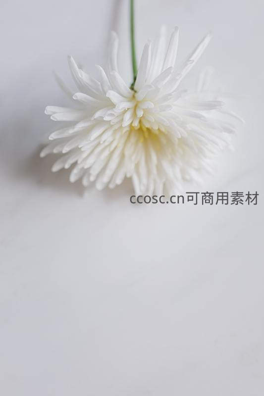 一朵洁白的菊花单独放置在干净的浅色背景上,绿茎向上延伸,花瓣舒展,整体构图简洁,传递出宁静、纯粹的美感。