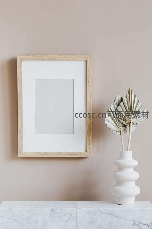 一张展示现代简约风格的静物摄影,木质相框搭配白色卡纸,旁边是造型独特的白色花瓶和干枯棕榈叶,置于大理石台面上,背景为柔和米色墙面。