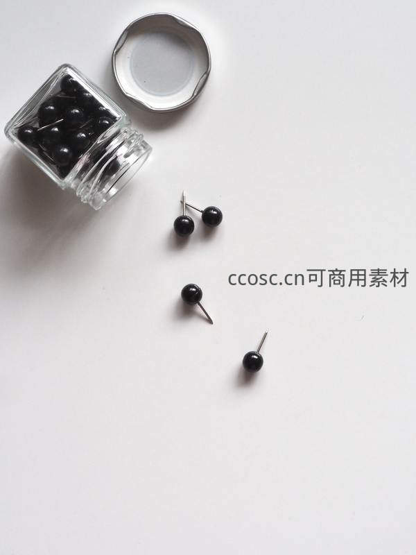 透明玻璃瓶倾斜,数枚黑色圆形图钉散落在纯白背景上,构图简洁,对比强烈,呈现一种冷静有序的办公用品美学。