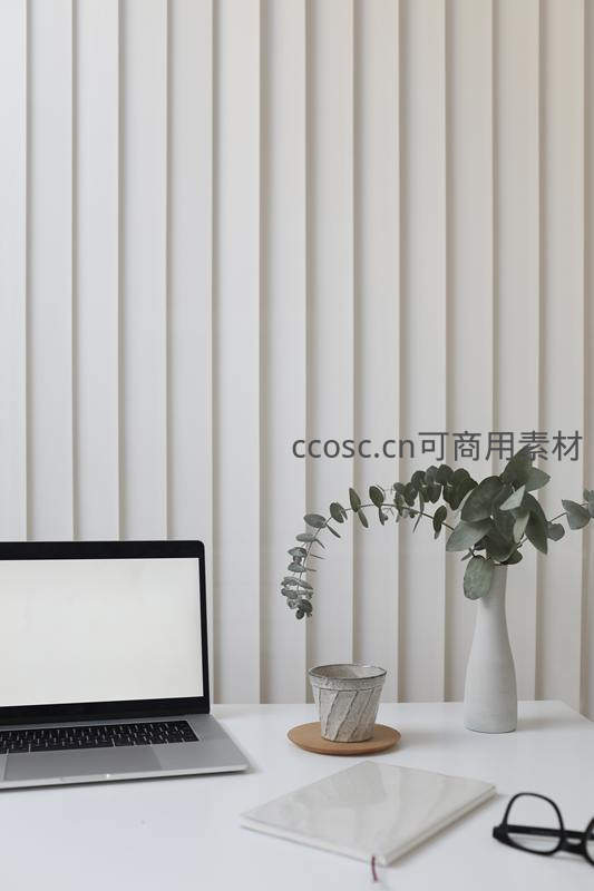 一张整洁的白色办公桌上,打开的笔记本电脑旁是插着尤加利叶的陶瓷花瓶、一本记事本和一副眼镜,背景是米色竖条纹墙面,充满文艺气息。