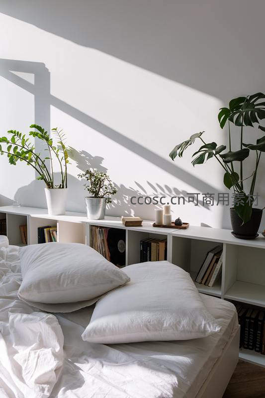 午后的阳光透过窗户,在洁白的床铺和书架上投下斑驳光影,搭配几盆绿植,营造出宁静舒适的居家氛围。
