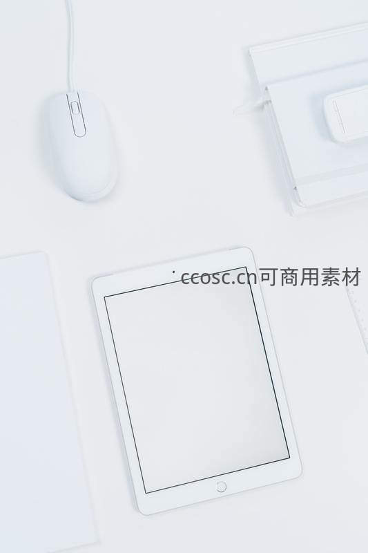 纯白背景下的现代办公桌面,摆放着平板电脑、有线鼠标和文件夹,整体风格简约干净,体现高效与秩序感。
