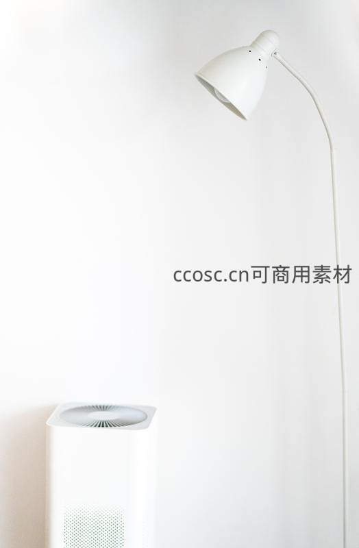 纯白背景下的现代家居一角,一盏设计感十足的白色落地灯与一台空气净化器相映成趣,营造出宁静、整洁的居家氛围。