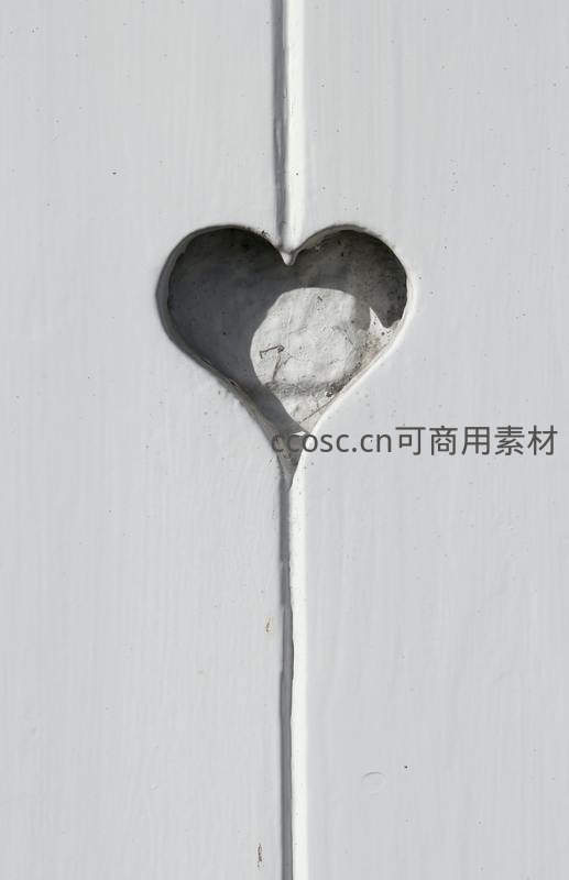 一块白色木板中央精心雕刻出一个心形镂空,边缘略显粗糙,透出背后灰暗背景,简洁而富有情感表达,适合浪漫主题设计。