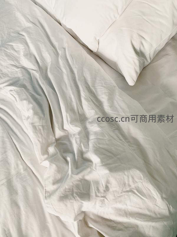 清晨阳光透过窗户,温柔地洒在略带褶皱的白色床单和枕头上,营造出慵懒舒适、宁静温暖的居家氛围,令人倍感放松。