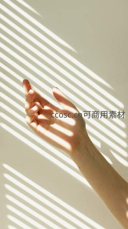 一只纤细的手轻抬于墙面,百叶窗投下平行光带,在皮肤上形成明暗交错的条纹,捕捉瞬间的宁静与美感。