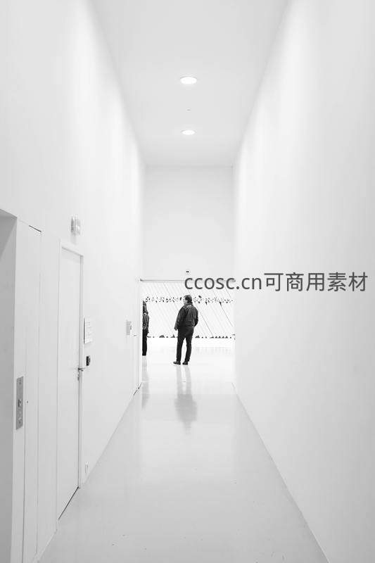一条空旷而明亮的纯白色长廊延伸至尽头,一个人的背影静静伫立,强烈的纵深感和极简的色调营造出一种宁静、孤独又充满哲思的空间氛围。