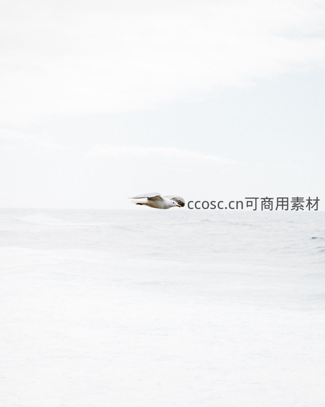 一只海鸥展开双翼,在广阔无垠的灰白色海天背景下自由翱翔,画面空灵静谧,传递出自然界的和谐与生命的活力。