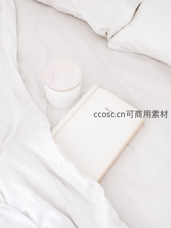 一本打开的笔记本和一个陶瓷杯安静地躺在柔软洁白的床单上,构图柔和,色调统一,展现慵懒惬意的居家阅读时刻。