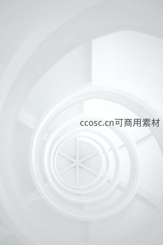 从顶部俯瞰一座纯白色的螺旋楼梯,其同心圆结构和中心的星形图案创造出一种宁静而迷人的空间感。
