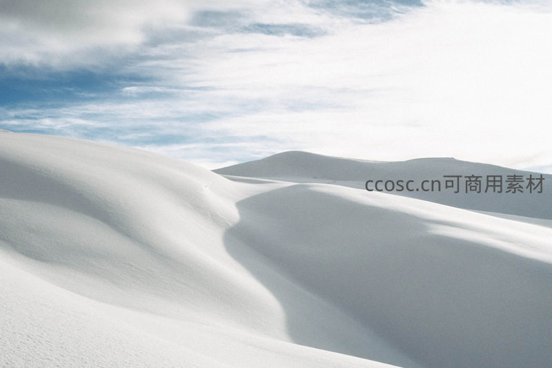 连绵起伏的雪丘在阳光下闪耀,柔和的曲线与蔚蓝天空相映成趣,展现出冬日自然景观的壮丽、宁静与无瑕之美。