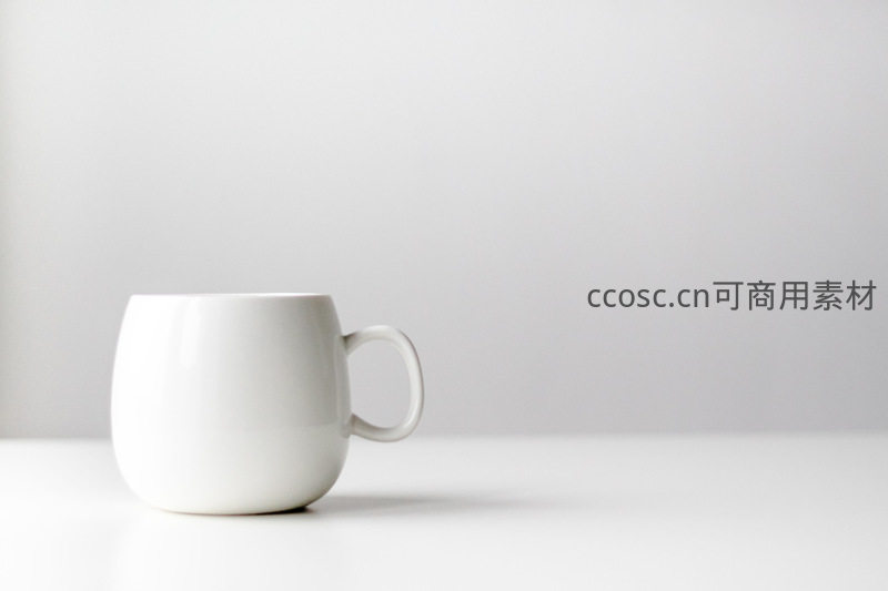 一只光滑的白色马克杯静置于纯白桌面上,背景干净利落,营造出一种简约、舒适且充满生活仪式感的宁静氛围。