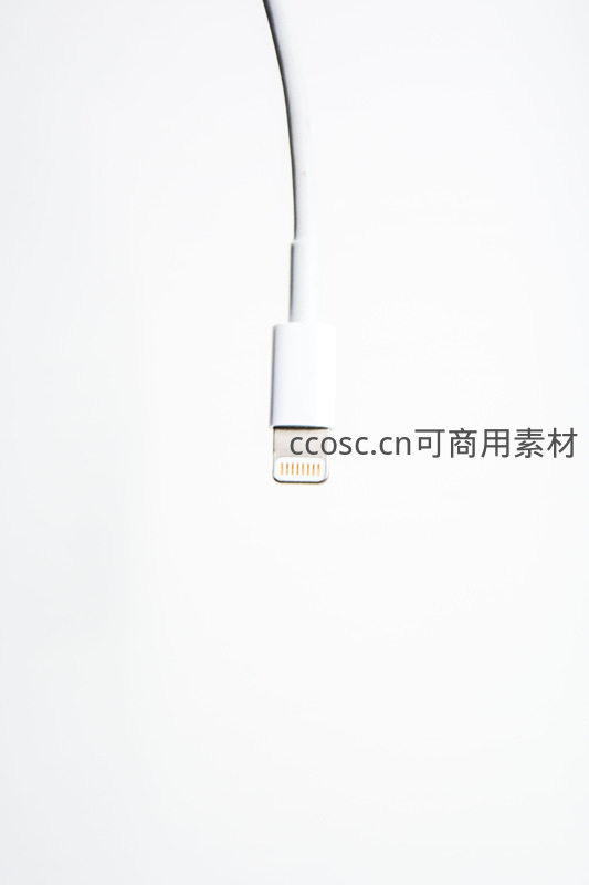 一根悬垂的白色Lightning数据线接头在纯白背景下清晰呈现,金属触点细节分明,凸显现代电子产品的精致工艺。