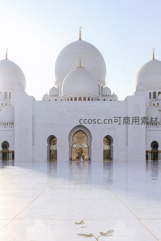 纯白大理石建筑群在阳光下熠熠生辉,巨大圆顶与金色装饰门廊构成庄严神圣的视觉中心,空旷广场倒影如镜,传递出信仰的宁静与崇高。