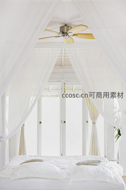 轻盈的白色纱幔环绕着整洁的床铺,木质吊扇静悬头顶,窗外光线柔和,整体空间散发出悠闲惬意的度假气息,令人身心放松。