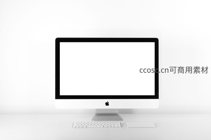 一台银色边框的苹果iMac电脑置于纯白桌面上,屏幕空白,前方配有无线键盘和触控板,整体画面干净纯粹,凸显产品的现代科技美感与简约设计。