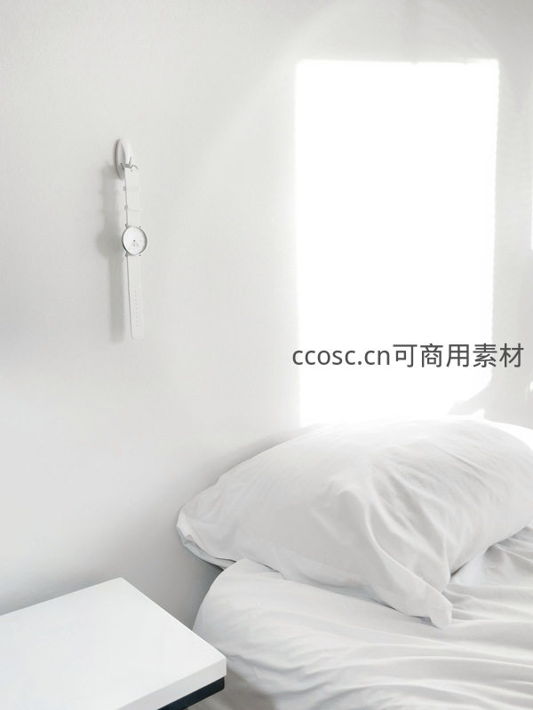 一束明亮的阳光透过窗户洒在纯白色的床铺上,墙边挂着一块简约的手表,营造出宁静、洁净且充满治愈感的睡眠空间。