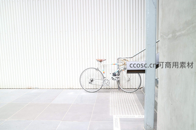 白色单车倚靠在简约金属墙边