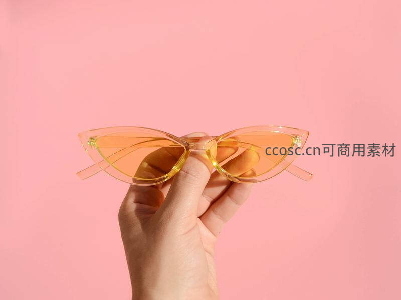 一只纤细的手优雅地托举着一副橙色猫眼太阳镜,镜片透亮,背景是纯净的粉红色,营造出清新甜美的视觉效果。