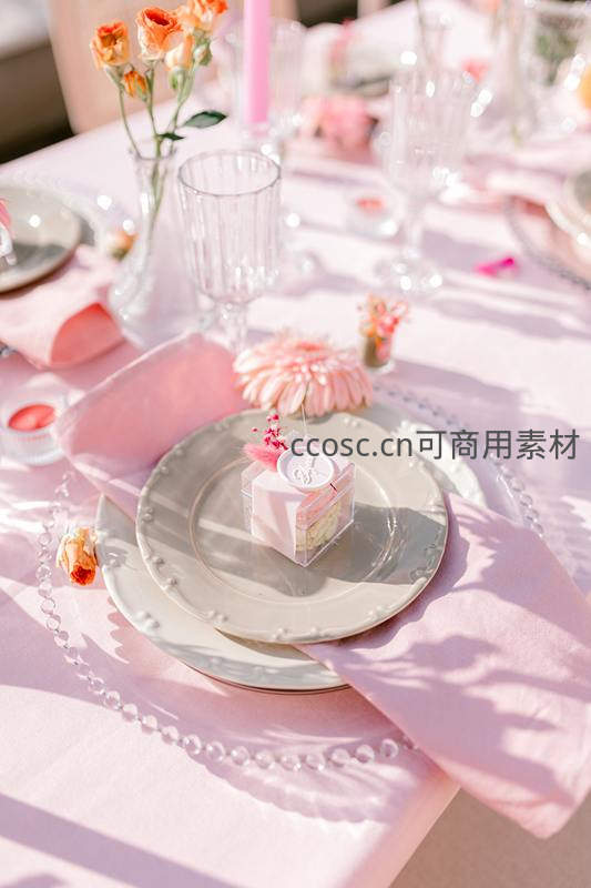 一张精心布置的粉色主题婚礼餐桌,摆放着层叠的餐盘、透明玻璃杯和娇嫩的鲜花,中央的小蛋糕点缀着羽毛装饰,阳光洒落,充满甜蜜与温馨。