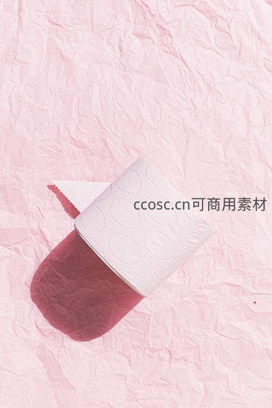 一卷带有圆形压花的白色卫生纸放置在褶皱的粉色纸张上,光影形成鲜明对比,突出日常用品的质感与美学,展现生活场景中的细节之美。